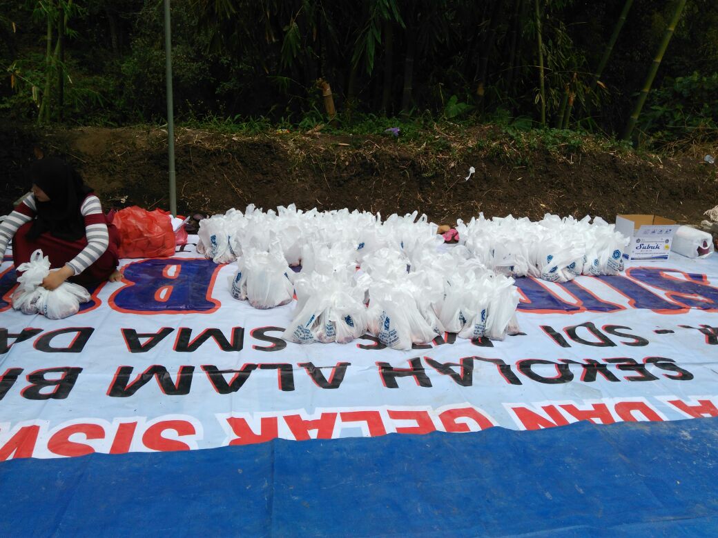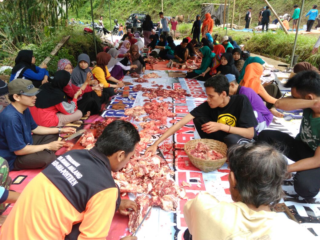 Daging yang sudah dipotong kecil-kecil lalu ditimbang dan dibungkus untuk dibagikan ke warga sekitar penerima kupon kurban oleh panitia.