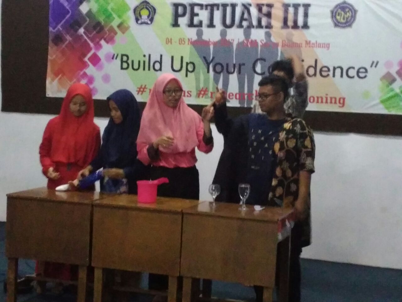 Itulah ungkapan salah satu siswa kelas XI disampaikan pada sesi praktek dalam kegiatan PETUAH 3 SMA SURYA BUANA MALANG dengan Tema BUILD UP YOUR CONFIDENCE. Kegiatan Petuah ini, diawali dengan STUDY VISUAL dan kabaret.