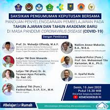 oleh sebab itu, pada Senin, 15 Juni 2020 Pemerintah melalui Kementrian Pendidikan dan Kebudayaan RI, Kemenag RI, Menkes RI, dan Kemendagri melakukan siaran langsung (webinar) dengan poin poin penting tentang panduan pembelajaran di tahun 2020/2021 sebagai berikut :