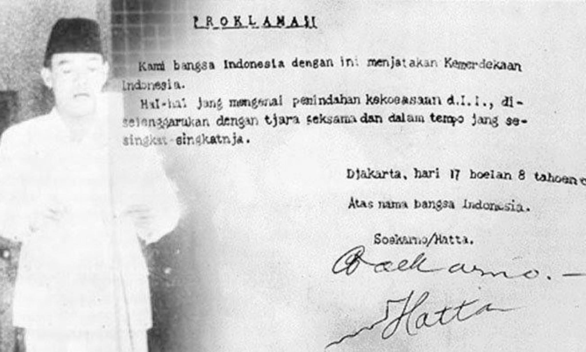 “Kami bangsa Indonesia dengan ini menyatakan kemerdekaan Indonesia. Hal-hal yang mengenai pemindahan kekuasaan dll. diselenggarakan dengan cara seksama dan dalam tempo yang sesingkat-singkatnya”.